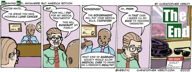 There’s a joke that a Canadian Breaking Bad would be a lot shorter because he wouldn’t have to worry about paying for his cancer treatment, but that misses the larger issues with Walt’s character. He has some good points, but he’s an incredibly prideful, arrogant man, burdened with a need to assert his masculinity. He was part of a startup company but left before it went big. His resentment explodes when he sees his former business partners again, and he point blank refuses to take their offer of a job that would give him plenty of money. Likewise, when his son sets up a website to solicit donations (a few years before GoFundMe would become a thing), he initially dismisses it as “begging.” In contrast, while Jesse is a hard living young man who uses the word “bitch” constantly, underneath he’s basically a good guy, and in portraying him actor Aaron Paul seems to have gotten really good at doing anguished crying.