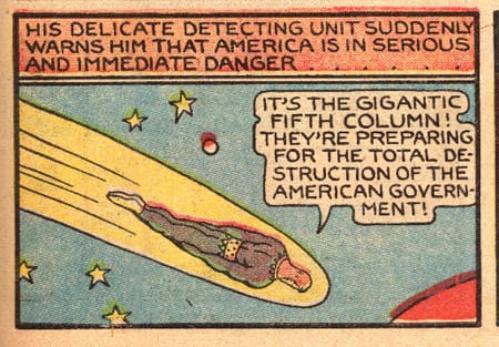 Where early Superman’s focus is on helping common people—an innocent woman being executed, an abused housewife—Hanks’ heroes mete out punishments like vengeful gods. Stardust is less Superman and more like the Old Testament God (as some Christians imagine Him; Jewish interpretations are more nuanced), and while Stardust is supposedly a guy using exceedingly advanced technology, there’s very little humanity in him. I have to wonder if the fact that Hanks’ father was a Methodist minister had something to do with it. Fantomah is a bit more about protecting her jungle and its inhabitants, but she barely even speaks to them. Instead, her dialogue is mostly dire pronouncements delivered to the villains who come to despoil “the jungle.” Also, since Hanks was working during World War II, both Stardust and Fantomah thwarted massive operations by the “fifth column,” ill-defined Axis sympathizers that were a hot topic in popular culture of the time. Such sympathizers did exist of course, but not to the absurd degree that Hanks imagined for his comics. Stardust went as far as to create a Sixth Column of patriotic boys, who he later equipped with powder blue starmetal unitards like he wears. It’s one of the creepier things in Hanks’ comics.